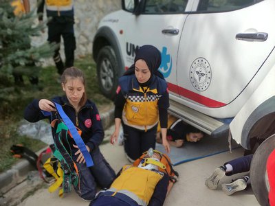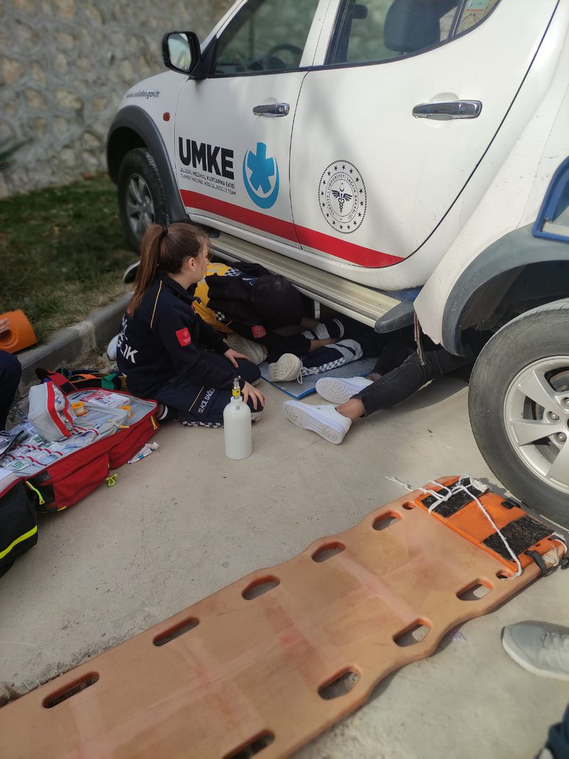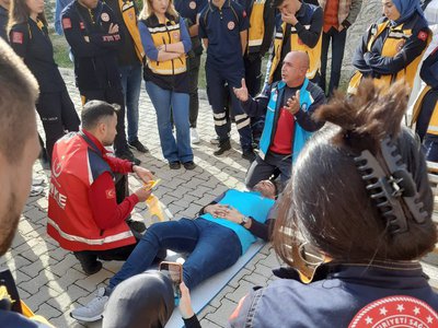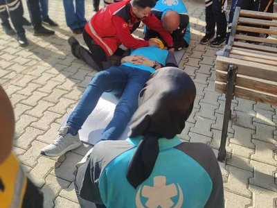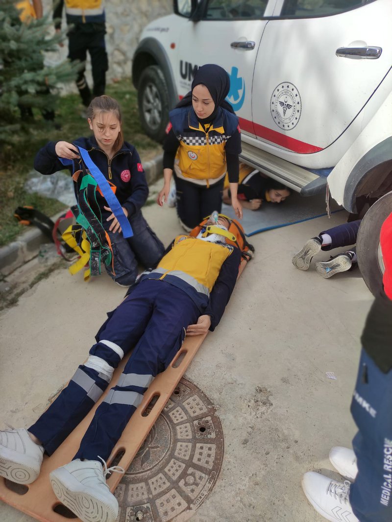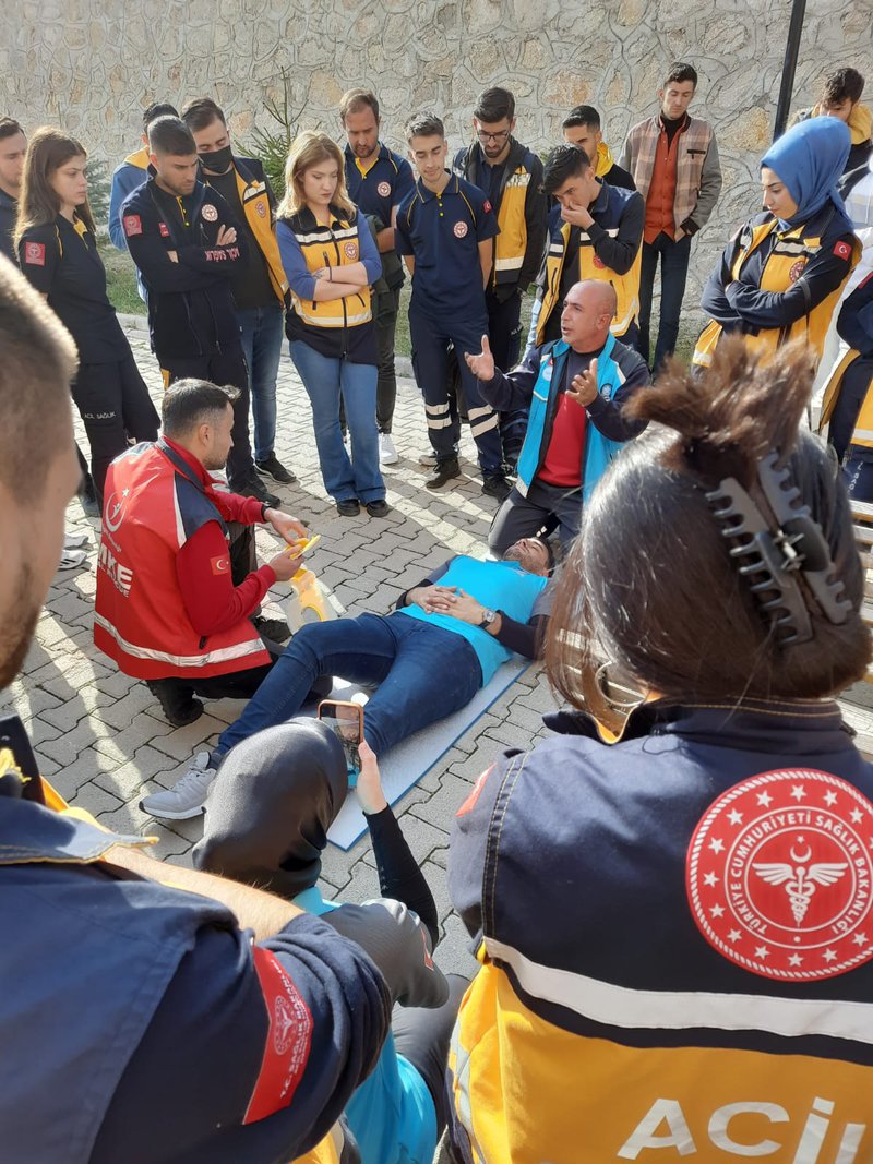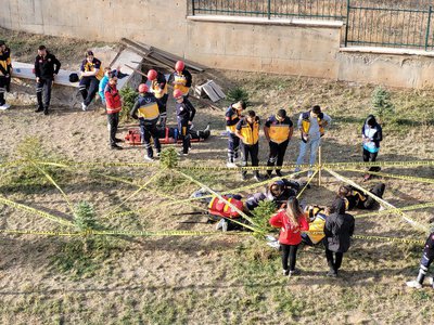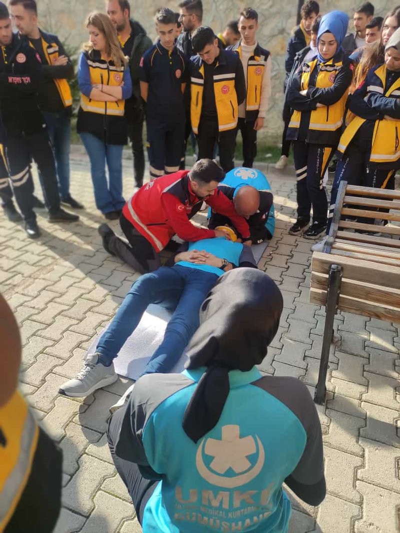 On November 15, 2023, the National Medical Rescue Team (UMKE) of Gümüşhane Provincial Health Directorate provided training to students on 'Extrication of Injured Individuals from Debris and Medical Intervention.' The training, prepared by UMKE, included scenarios involving earthquakes, explosions, and injuries inside vehicles. Students were trained on providing assistance and extracting injured individuals from debris, maintaining balance on stretchers, overcoming obstacles as a team, and identifying emergency cases in mass casualty incidents.